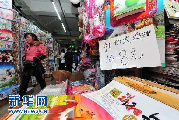 12月18日,銀川市東方商城一家主營(yíng)臺(tái)歷賀卡的商鋪掛出了打折處理的牌子吸引顧客。 “公款賀卡”禁令出臺(tái)后,寧夏銀川年歷賀卡市場(chǎng)銷售遇冷,單位、企業(yè)大量購(gòu)買賀年卡、年歷、明信片的情況今年阿基本消失,顧客以散客為主。銀川市各商城內(nèi)銷售賀卡年歷的商家生意冷清,部分商家開始降低零售價(jià)格。 新華社記者 彭昭之 攝