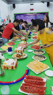 為員工慶祝生日是森榮手袋歷來已久的傳統安排,隨著企業一年一個臺階的上升,這個大家庭的人數也在不斷增加,每個季度的最后一個工作日,就是本季度所有壽星的生日。當天下午五點三十分,在生日快樂歌聲中,八十位壽星陸續走進會場,長桌上擺滿了為他們準備的精美食物,甜點水果零食小吃,應有盡有,色彩豐富,森榮設計師們把專業特點發揮到餐桌上時,也絲毫不顯生疏。