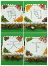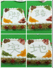 八個方形生日蛋糕一字排開,寫著今年的標語腳踏實地,勇闖天下。