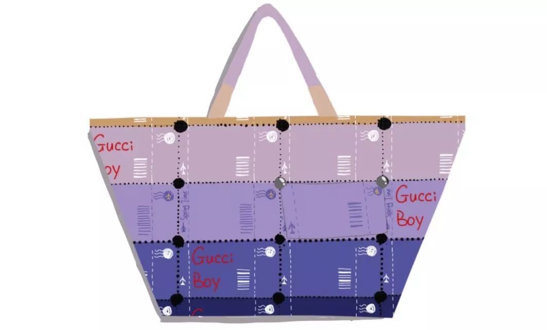以郵票以齒空相連成為整體為設(shè)計(jì)思路,以當(dāng)季流行色紫橙漸變?yōu)橹饕渖?。這是由許多明信片相連組成的紋樣,明信片記錄著遠(yuǎn)方朋友祝福、思念和美好,而隨著微信、QQ的沖擊,越來越少人會(huì)想到寫信,這是對(duì)從前那個(gè)很慢的時(shí)代的追念。而明信片上隨機(jī)出現(xiàn)印有“Gucci Boy”的字符,是時(shí)下社會(huì)風(fēng)氣衍生出來的價(jià)值觀,無論正確與否,都值得我們深思。