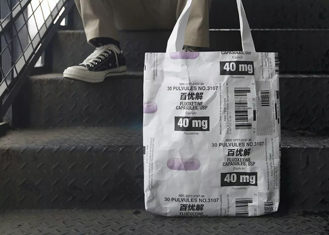 百憂解是一種抗抑郁的藥物,設(shè)計(jì)師從網(wǎng)絡(luò)“喪文化”提取關(guān)鍵信息,印刻在藥丸圖案上,表現(xiàn)年輕人對(duì)現(xiàn)實(shí)生活的一種自嘲態(tài)度。